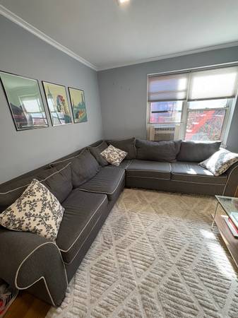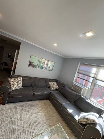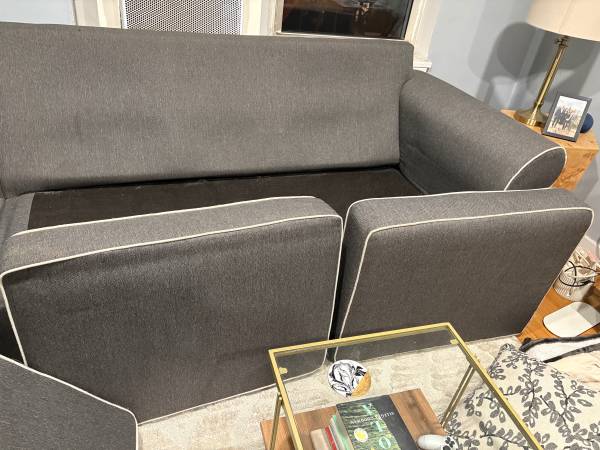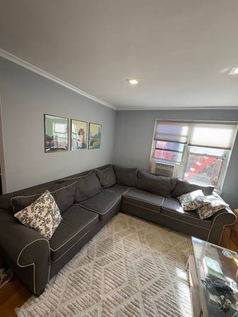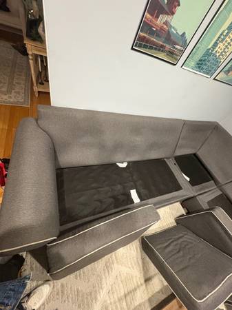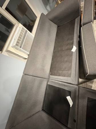 112 inches wide (both sides). 38 inches deep Great condition, no pets, smoke free house. Bobs furniture. Only selling because I am moving to a smaller apartment.