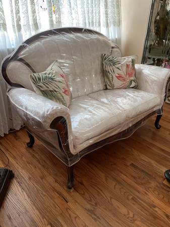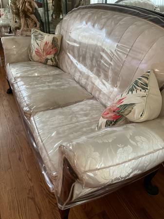 Italian Provençal Sofa 86 incheis wide by 33 inches tall and 35 inches deep, loveseat 65 inches wide 33 inches tall and 35 inches deep, chair, 44 inches wide 33 inches tall and 35 inches deep. Dark walnut frame with white to off-white patterned fabric. open to reasonable offers.