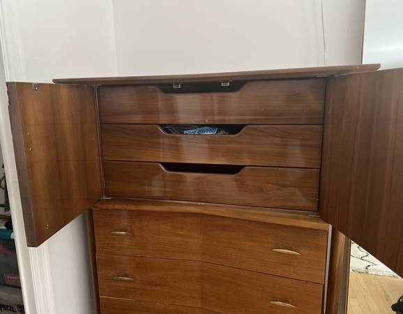 Embrace the timeless allure of mid-century modern design and invite a touch of Piet Hein's artistic brilliance into your home with this remarkable walnut and brass highboy dresser. The combination of its striking visual appeal and functional design makes it a perfect choice for both vintage enthusiasts and those seeking a statement piece. Elevate your living space with this exceptional highboy dresser, and enjoy the seamless fusion of style and practicality it offers.
