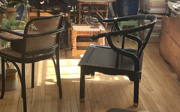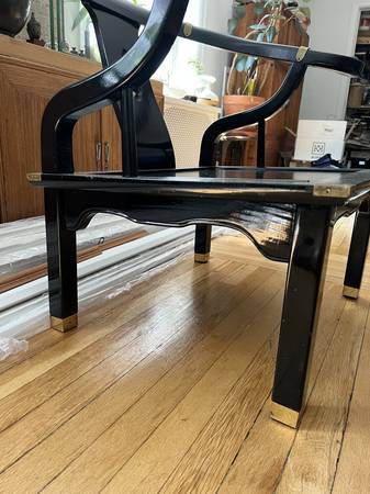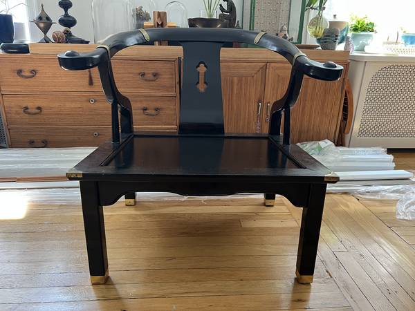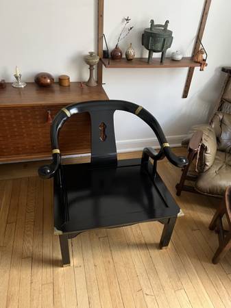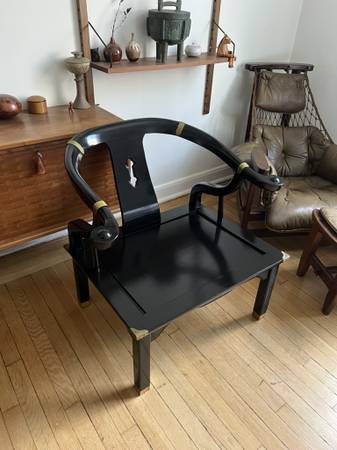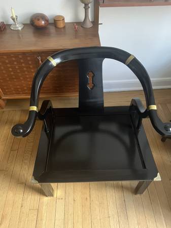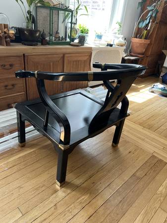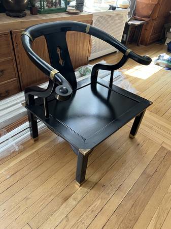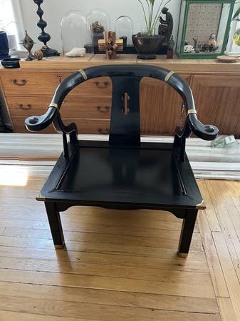 Rare Original Chin Hua Black Lacquered Chinoiserie Armchair with Brass Details James Mont Style Horseshoe Chair High Quality Vintage Black Lacquered Horseshoe Armchair with Brass Accents Style:...