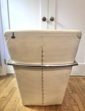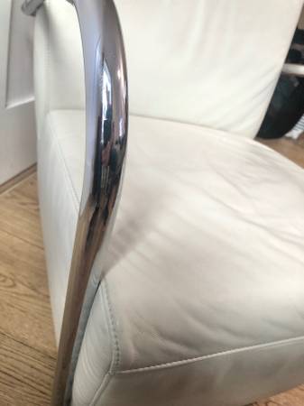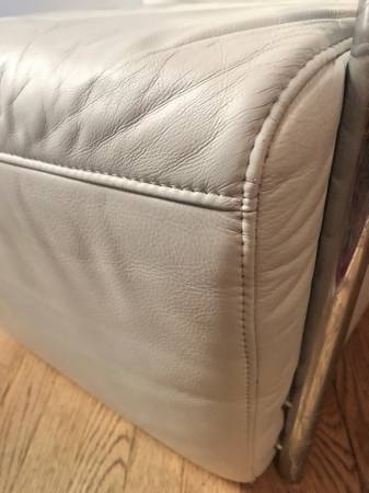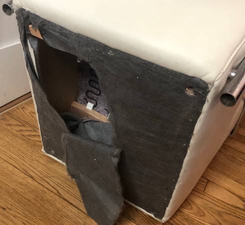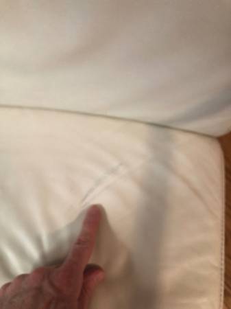 Has one stain on the seat (see pictures) and a little damage in a small spot on the top.