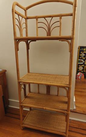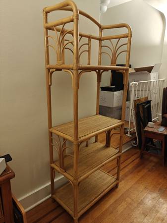 Gorgeous rattan shelving with minor scratches (see image), very lightweight. 67 inches tall (back of unit to floor), 26 inches wide, 13.75 inches deep. Pickup in Jackson Heights