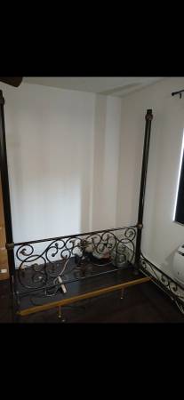 Iron, Queen bed frame for sale. Great condition. Extra iron decorative canopy piece on top that connects all 4 posts. Room is too small to fit on top.And a black canopy curtain included.
