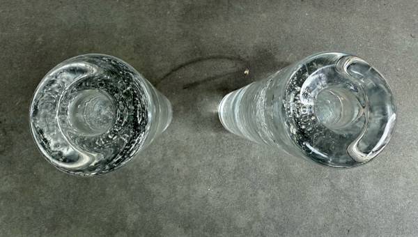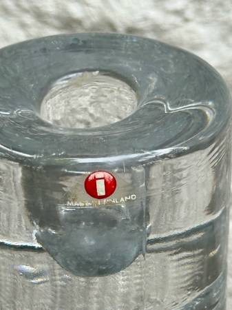 Pair of tall cylinder glass candle holders designed by Timo Sarpaneva for iittala, Finland. The pattern is called Arkipelago and each one measures11 1/2” tall by approx 2 1/2” in diameter. One candle holder retains it’s original label and the other candle holder has a few chips along its base.