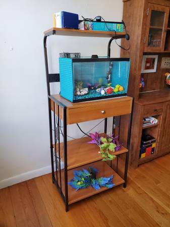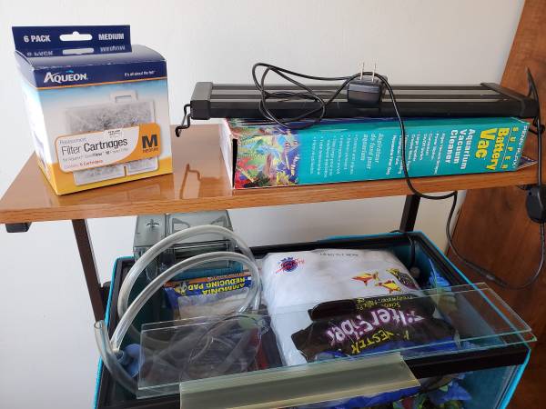 Includes stones, bowl, fake plants, vacuum, filters, light. $50