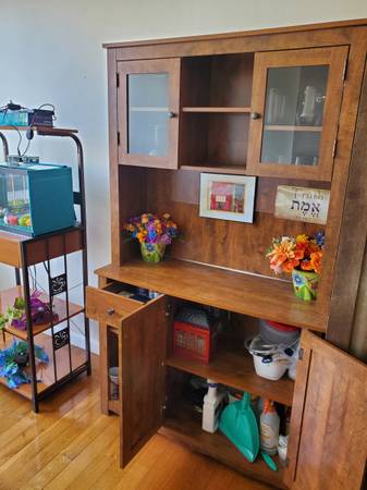 Two glass cabinet doors, two wooden cabinet doors, one drawer. Can be taken apart into upper and lower sections for easier moving. $200