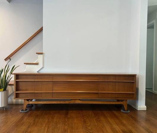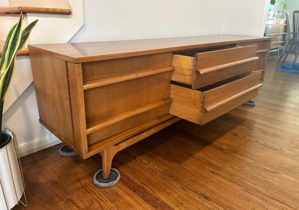 Manufacturing Co. Features sculpted walnut pulls that extend the full length of the credenza, tapering in the middle and expanding again towards the end. The body of the credenza emulates this tapered design with its front profile curve. Two dovetail-constructed drawers with a cabinet on each side, sitting on a geometrically-cut floating leg base.