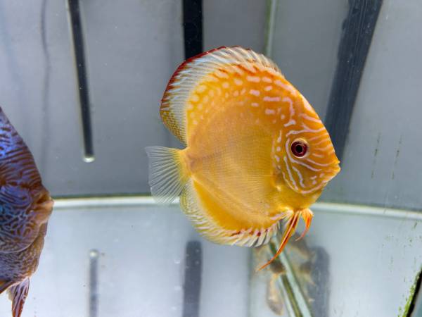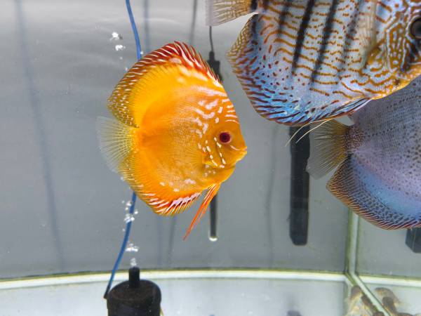 Discus fish for sale. $100 for 2 Albino discus 5” pickup only. Text me if you are interested.