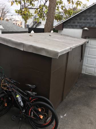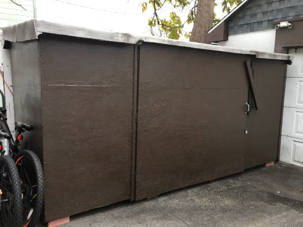 This durable storage wood shed: $299 With external dimensions: 5 feet W. x 8 feet L. x 6 feet H.