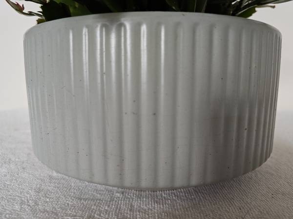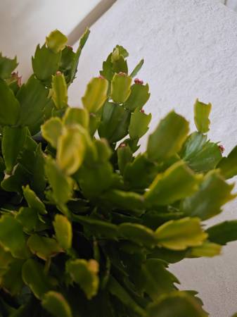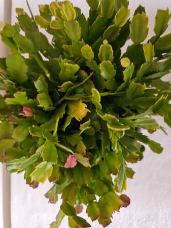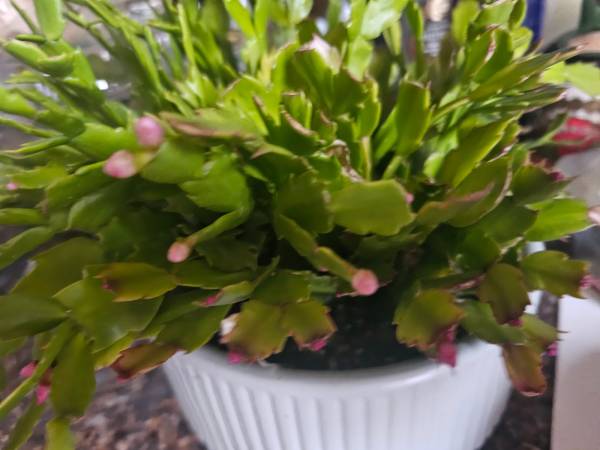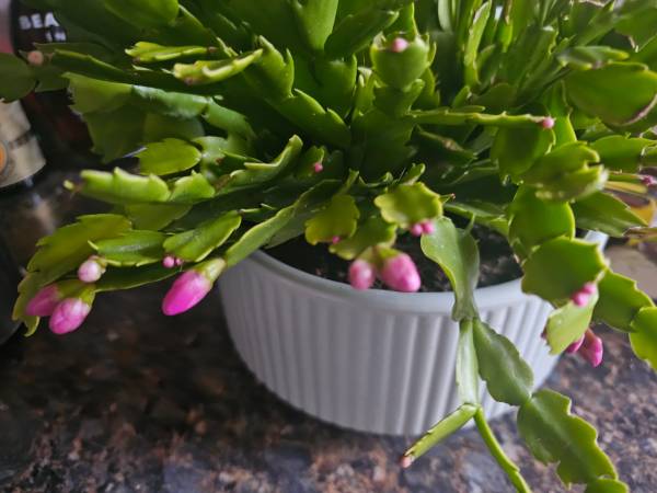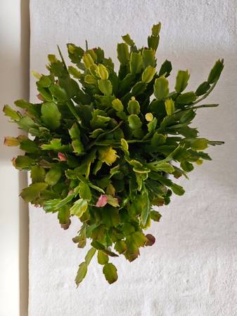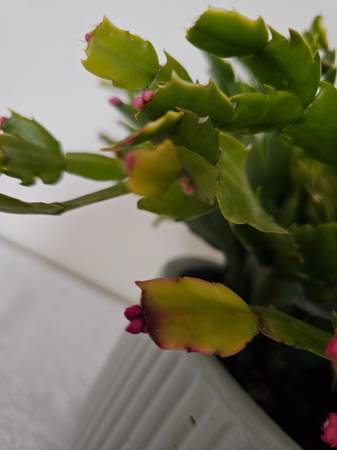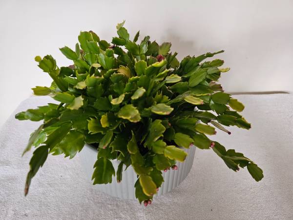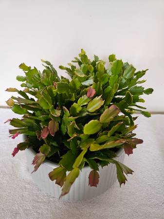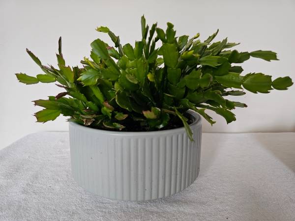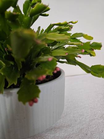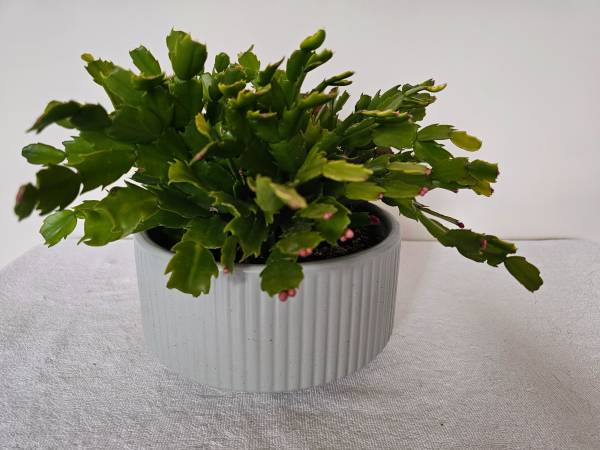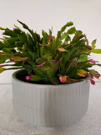 Christmas Zygo Blooming Cactus Plant in a Pot. The plant is healthy and ready to bloom. Pot measure 4.75'' x 9''. Steel color, no cracks or chips.