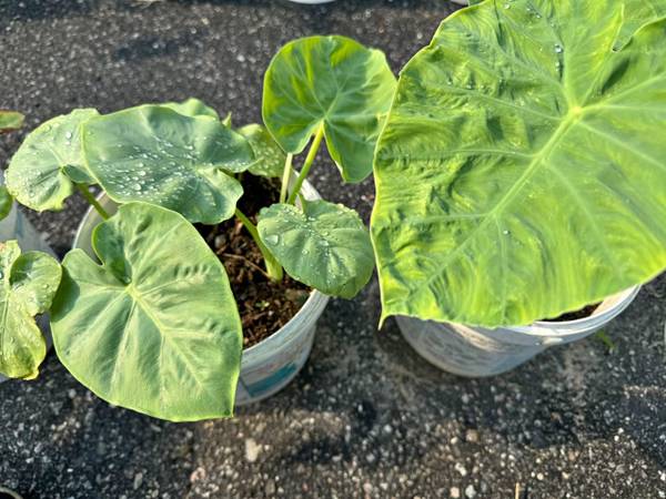 Elephant ear plants for sale. They come in pots priced at $10, $15, or $20.
