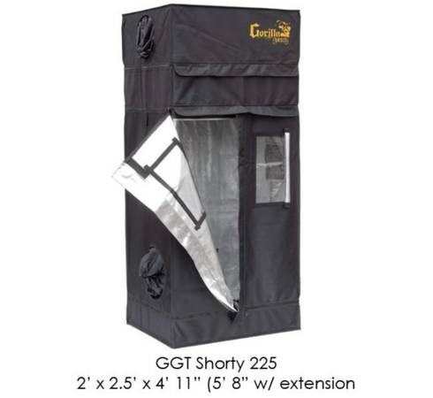 Gorilla Grow Tent SHORTY 2′ X 2.5′ GGT22 SHORTY GGT 22 Dimensions: 2’ x 2.5’ x 4’11” Height w/ Incl. Extension Kit: 5’8″ (also compatible with OG Gorilla 24″ extension kits) Weight: 29 lbs. Canvas...