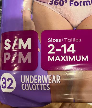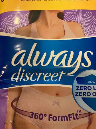 We have 6 packages of brand new Always discrete 32 count underwear. Size S/M P/M 2-14 Maximum absorption For incontinence and other diaper needs. $15 each or $70 for all 6 Brand new not opened packs.