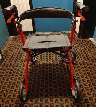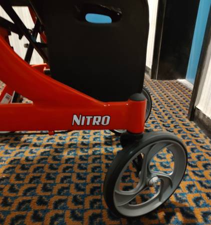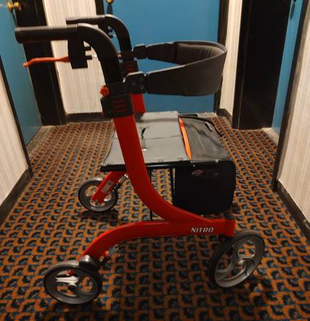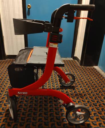 Drive Medical Nitro Aluminum Rollator Standard Height. Larger 10" Wheels. Like new. Mint condition. Used once. Travel in style with the sleek design of the Euro-style Nitro Rollator. This rolling walker is cleverly engineered with a comfortable seat, convenient storage bag, adjustable height handles, and large 10” front casters for seamless rolling. With the brake cables inside the lightweight frame, the rollator walker provides a safe experience when you’re out and about. With the ability to fold side-by-side, the Nitro Rollator is easily transported and stored.