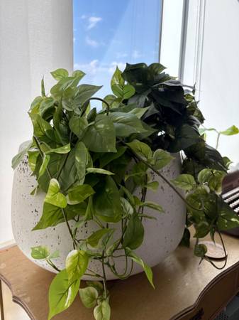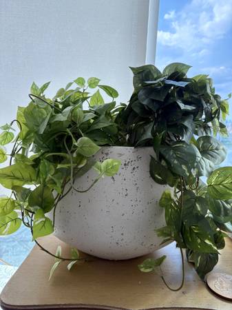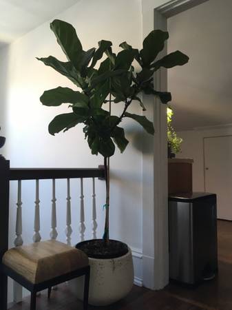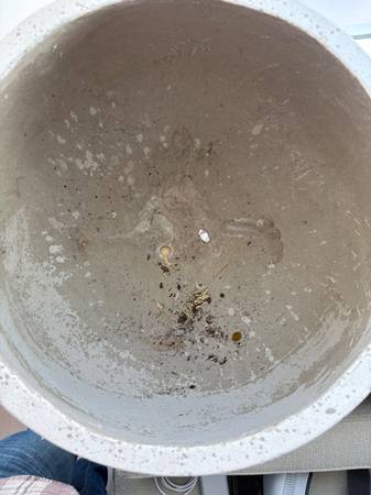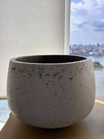 Great for fiddle leaf figs or other indoor trees/plants! Large concrete-appearing (not actual concrete) planter in great condition. Has one drainage hole at the very bottom. But I just used the plastic pot the tree came with for ease of use. Please note: planter DOES NOT come with any plants in it! I just put those photos so you can see how nice it looked with plants. Those fiddle leaf figs died long, long ago because my place didn't get enough light. :(