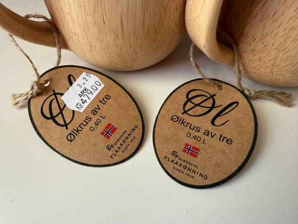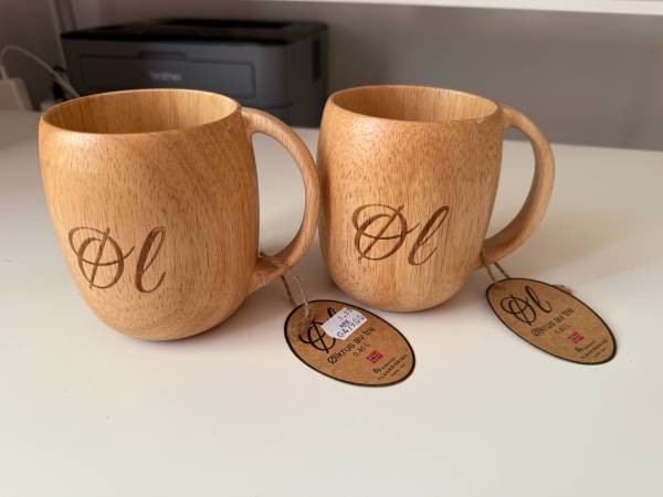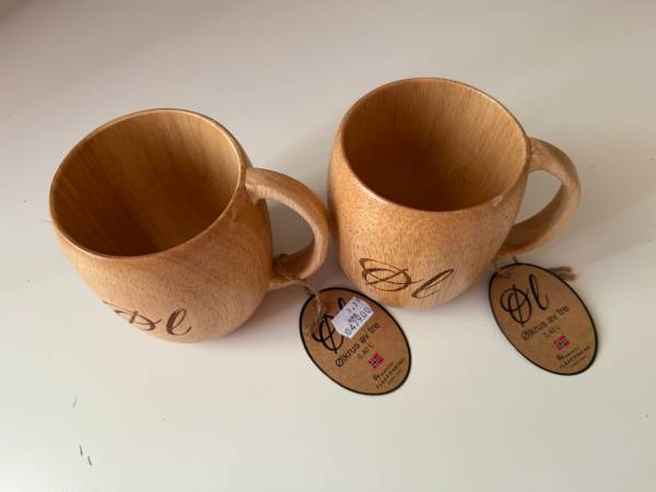 Two brand new wooden coffee mugs bought from Norway. Were supposed to be a gift but we changed our minds lol.