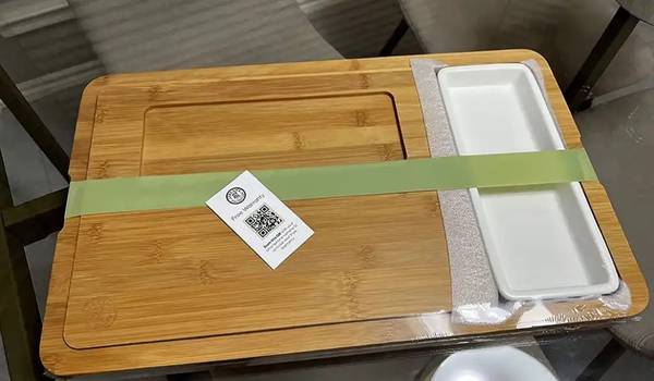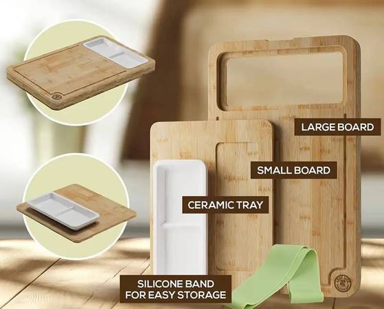 New unopened unused in original box 3 piece bamboo charcuterie board set including large cutting board, serving board, ceramic tray and silicone band. Durable, long lasting and easy to clean and store.