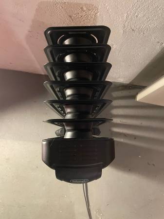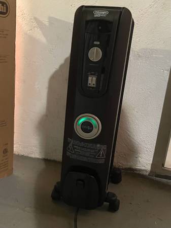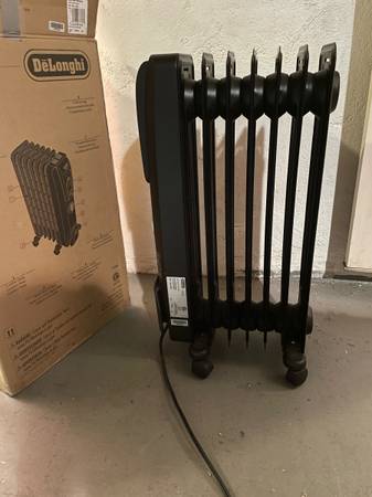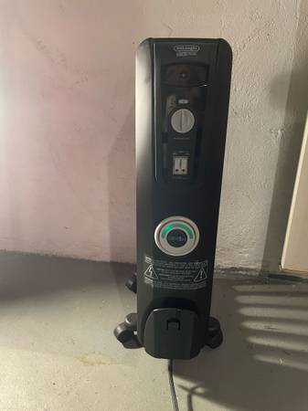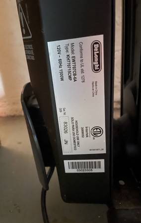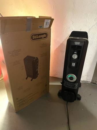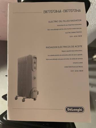 De’Longhi EW7707CB radiant heater, 1500-watt, barely used, and in its original box with instruction guide. It weighs about 24 lbs and works great. Cash only please.