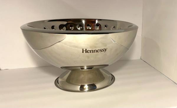 This Hennessy Large Footed Double-walled Ice Bucket/Bowl has a bubbled design on the inside. It is a sleek ice bucket perfect for all occasions. This is a stylish and practical addition to any entertaining setup or cocktail bar. Its large size allows for plenty of ice to keep your wine, champagne and any other drinks cool, while adding a touch of sophistication to your table. It is approximately 17” diameter and 9.5” high. The foot measures approximately 9.5” diameter. Please see pictures.