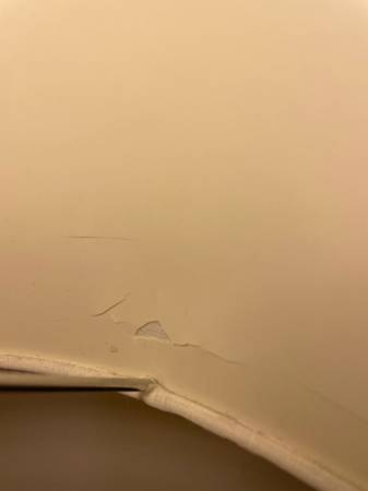 Two Ren-Wil table lamps, bronze and metal. This model is discontinued . Includes cream-colored fabric shades which show some chipping on the interior and the exterior shows minor scuffs. For their age, they’re in decent condition. Shade 9” H, and 14” W.