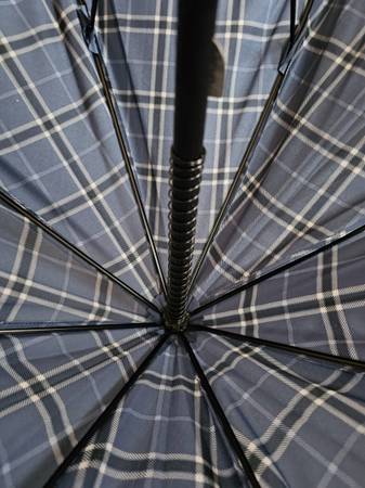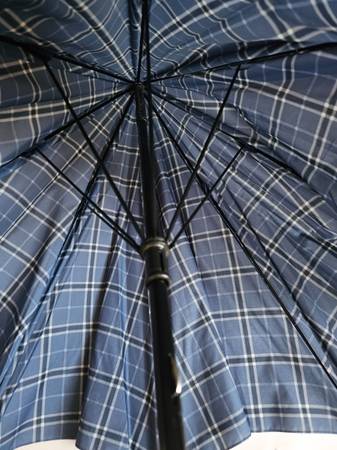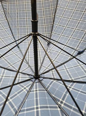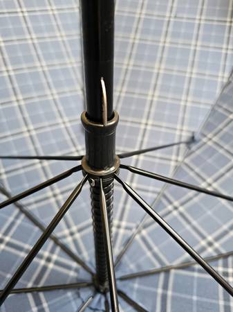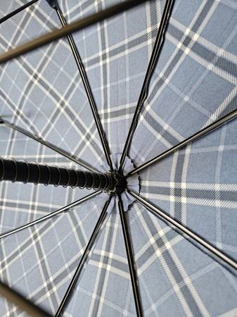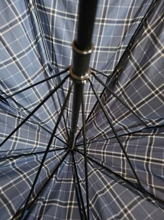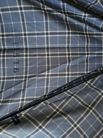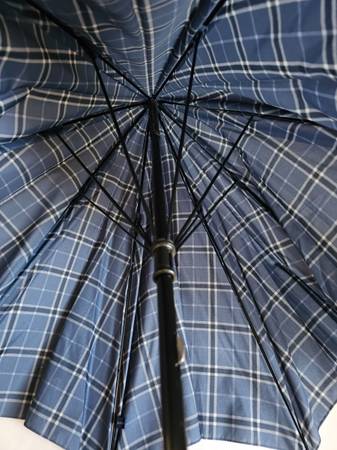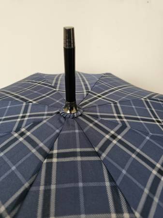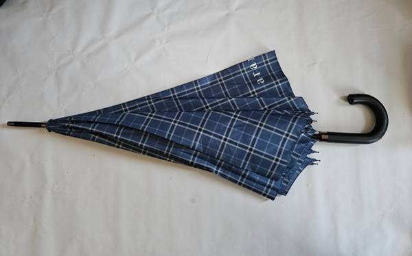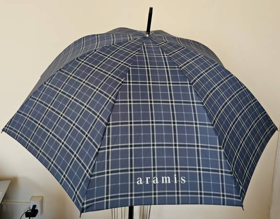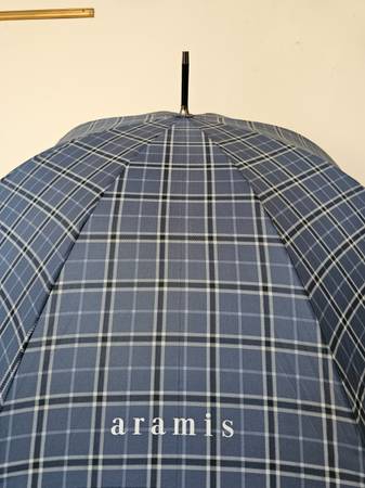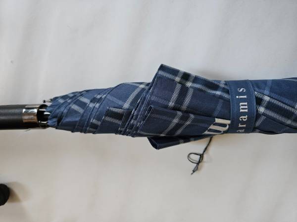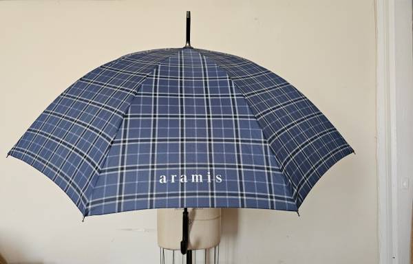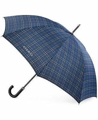 Aramis Classic Men's Plaid Umbrella Classic plaid polyester fabric Measures: 37'' long with 55'' canopy when open. White Aramis logo printer on umbrella and the wrap/ Please note that handle...