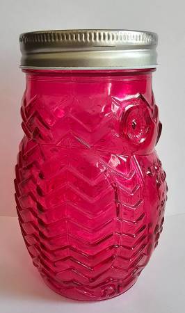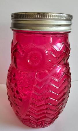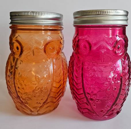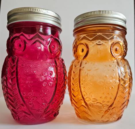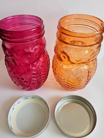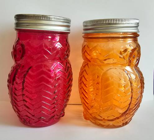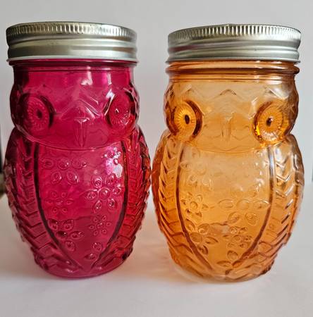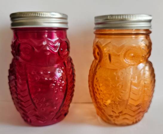 Glass Owl Shaped Storage Jar, Canister, Set of 2 Purple and orange jars with screw on lids. Great looking embossed glass: each jar has a shape of an owl with a face, tail, wings and feet. 5.5" H x...