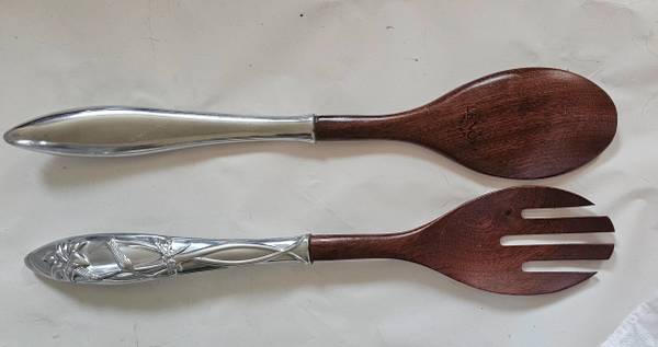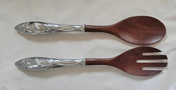 Set of 2 serving Utensils, fork and spoon measuring 14.5" Long, 7" Metal handle 2.3/4" W
