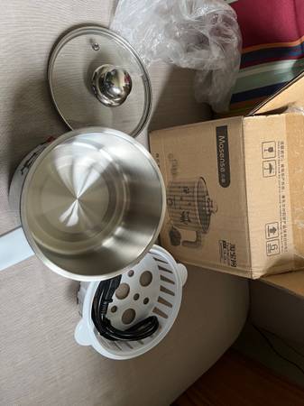 A brand new 1 liter electric pot. Useful for heating water, cooking noodle soups, heat up leftover, steaming, making tea, etc. Great for home or office.