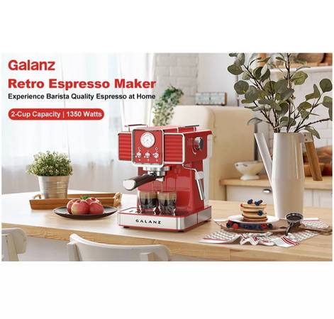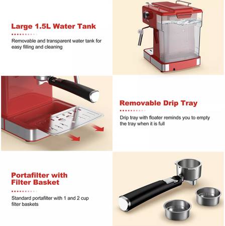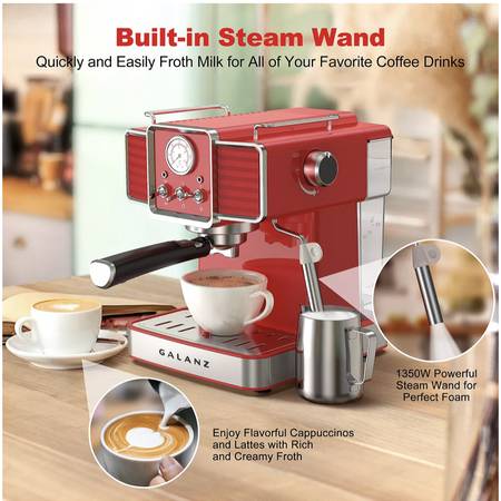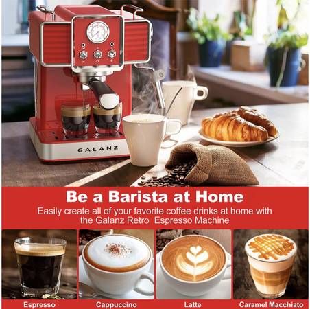 Everything you need for barista quality coffee at home in a compact, retro design. 15 bar high pressure espresso machine. The pressure meter indicates the optimal level for brewing helping you to brew consistent, delicious espresso. The interchangeable 1-cup and 2-cup filters, easy to use controls and powerful, built-in steam wand makes creating barista quality drinks at home easy.