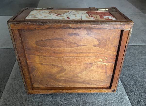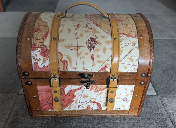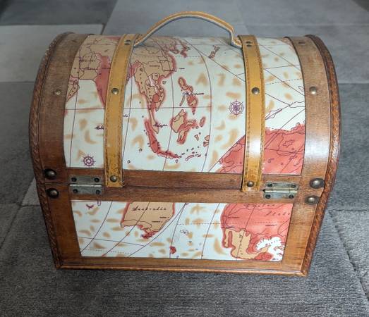 This wooden trunk features leatherette straps, hinges, and a map. It's in good condition. Base measures 13.5" x 11" Height of box is 11" (without top handle) * Home Decor * Steampunk * Pirate