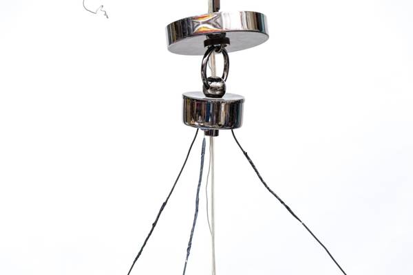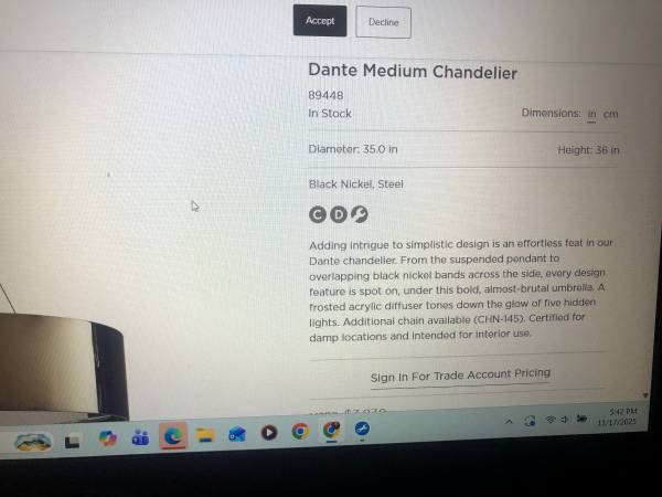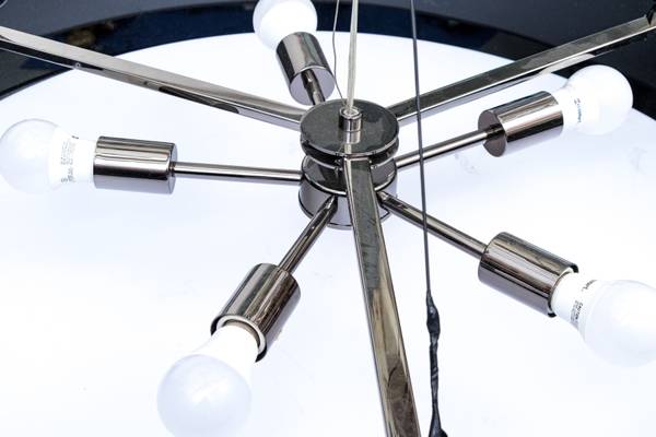 This Arteriors Dante chandelier is in very nice condition. It measures 36” in diameter and the nickel plated band is 8” high. It has minor abrasions that are not very noticeable. The mounting...