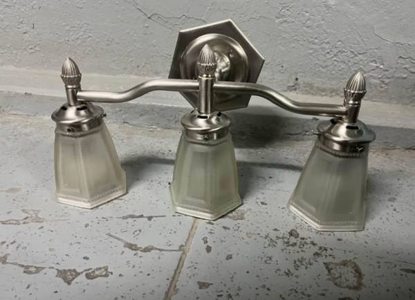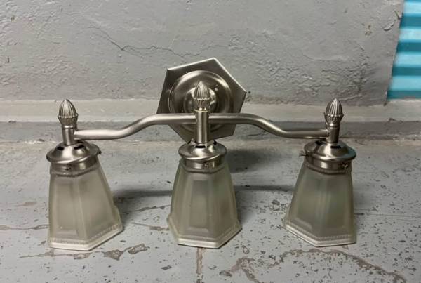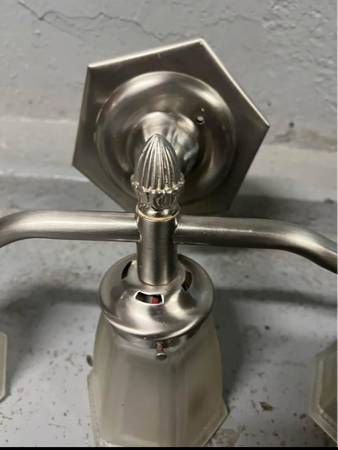 Remodeled and selling vanity light. Silver design with three globes. Mirror in photo available also for 65 or best offer.
