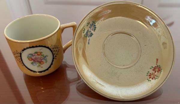 Sizes do not include handles or spout. Teapot and sugar have fading on the handles as well as on the saucers.