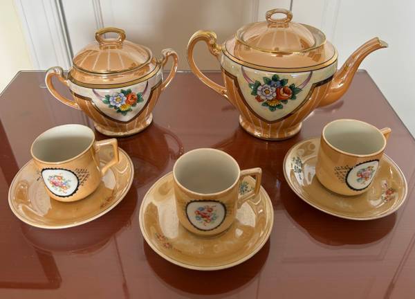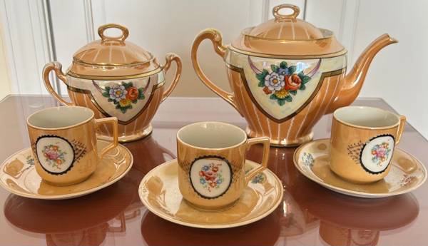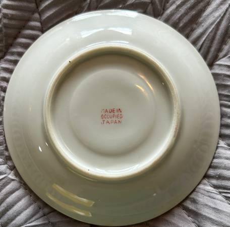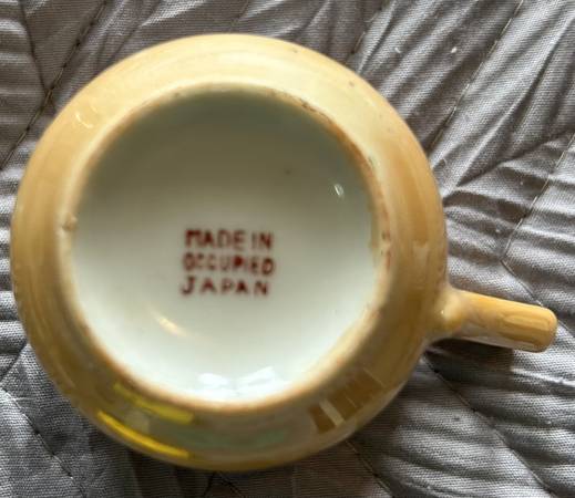 The teapot and creamer have a Noritake hand painted stamp where the cups and plate have a Made in Occupied Japan stamp.