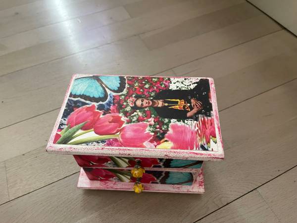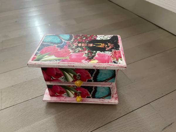 Covered in flowers, this enchanting jewelry box emulates a prized antique.