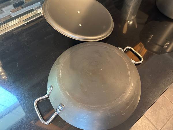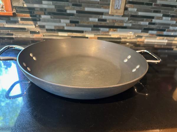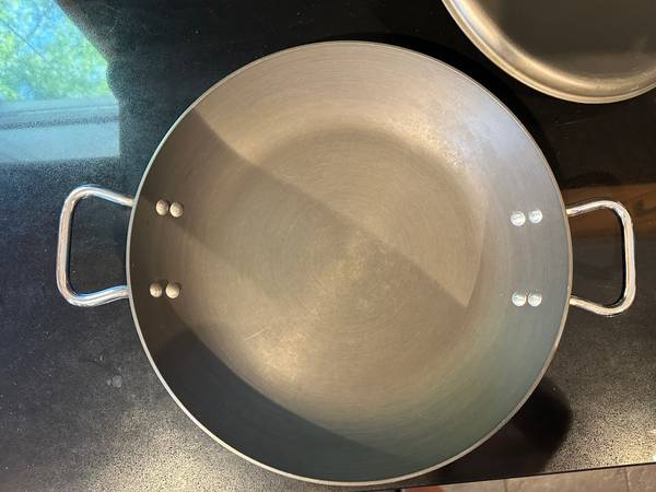 Vintage Calphalon anodized aluminum paella pan with cover.