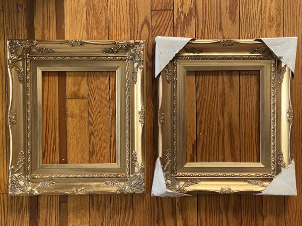 Selling two beautiful gold, ornate, and charming frames. They are made of wood and would complement any sophisticated decor. Add your own original art to be complemented by these gold frames. They hold 8 x 10 artwork canvases. If this ad is still up, it is still available.