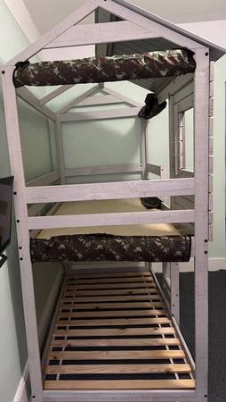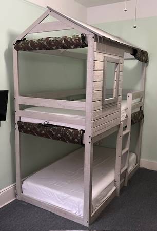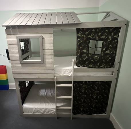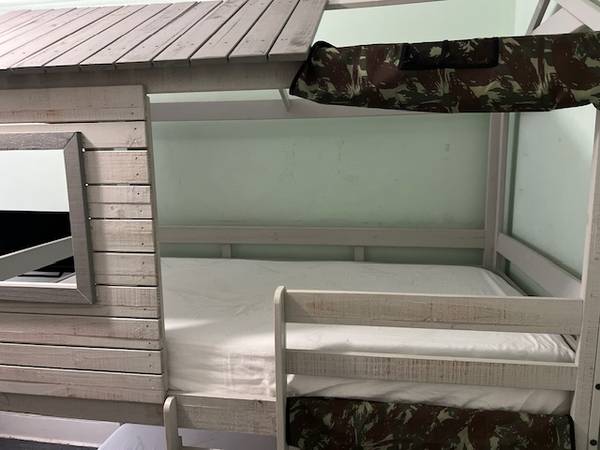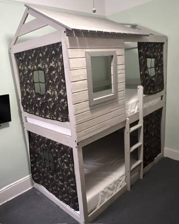 Used in Excellent Condition Kids Deer Blind Cabin Twin Over Twin Rustic Grey Bunkbed with Green Camo Tent Plus 2 Twin Mattresses. Price $555 Cash and Pick Up ONLY From Ridgewood 11385 Queens. Thanks...