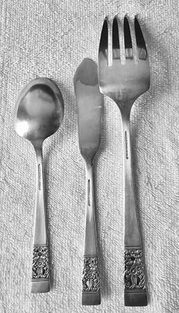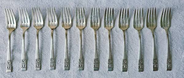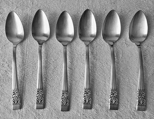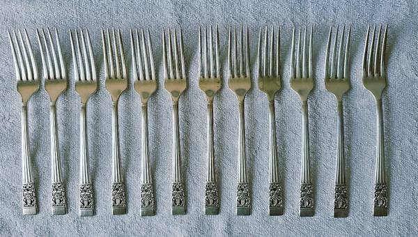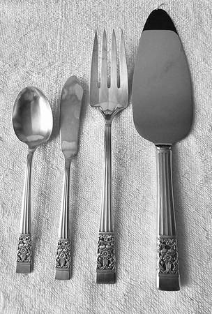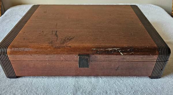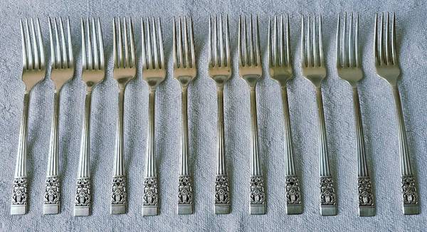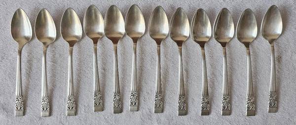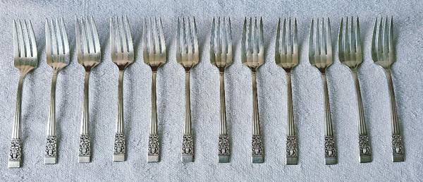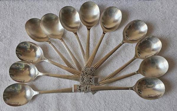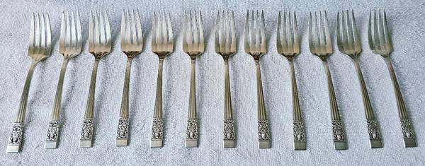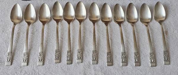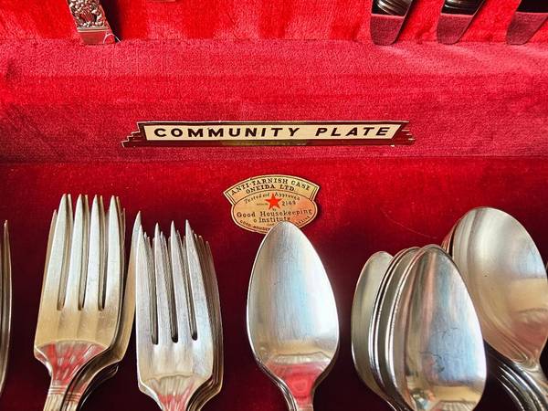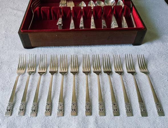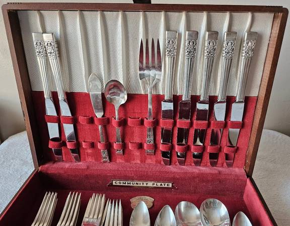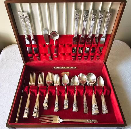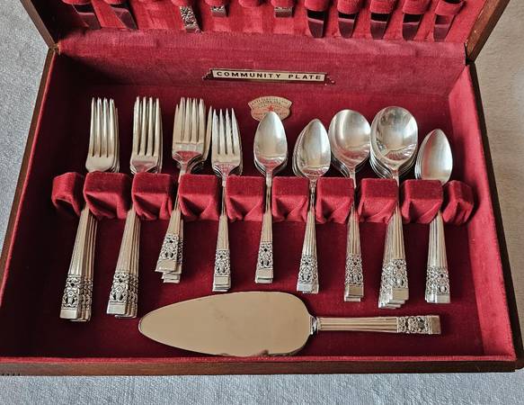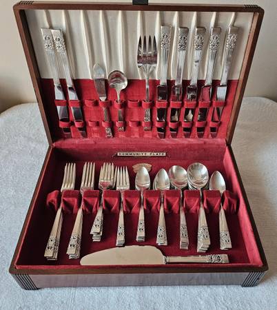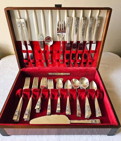 Coronation by Community Silverplate Vintage Flatware Set for 12. Total 65 Pcs. Anti-tarnish wood storage box with red velvet lining-15.5'' x 11'' x 3''. Includes 5-piece set. 1936. 12 Dinner Forks,...