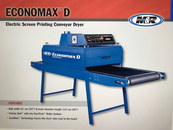 Selling a professional M&R Economax D Conveyor Dryer, a shop standard for curing screen printed garments. Purchased new for $5,600 β asking $2,199 OBO. Save thousands on a reliable, production-ready unit.