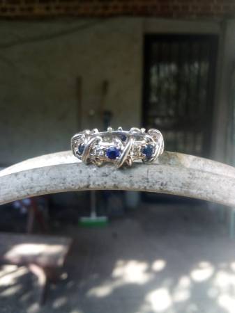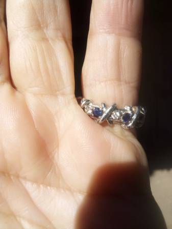 14K white gold, diamond and sapphire XOXO ring. Size 6.