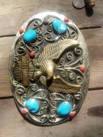Vintage Native styled Harley Davidson belt buckle with coral and turquoise in saw tooth bezel settings. HUGE.