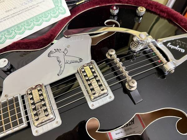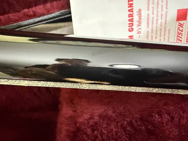 Features include silver sparkle finish, gold hardware, Bigsby tailpiece, ebony fingerboard, and Filter'Tron pickups for that rich, chimey Gretsch tone. There is one factory blemish on the underside of the neck beneath the finish, purely cosmetic and can’t be felt when playing.