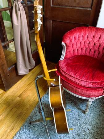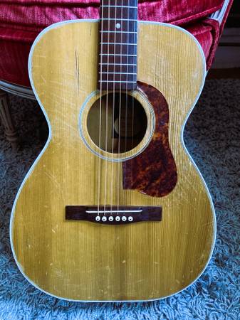 Short scale, solid spruce top with maple back and sides- they only made these for three years (they switched to mahogany for the b&s by 1959)- small body (about the size of Martin 0-18). Player's condition, but without any breaks, cracks, or major issues. Neck straight, good action. See photos.