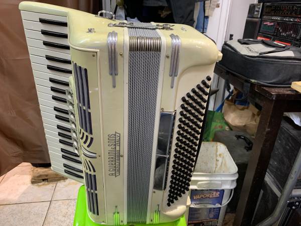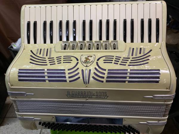 And know legendary A Guerrini and sons 120 bass piano accordion this accordion on excellent working condition all reed in tune no smell no staking keys no air leaks . Accordion has 120 bass on left side and 41 keys on right side 3 reed musette tune in rights side ,and 5 reeds on left ,all hand made reeds . Accordion has 7 switches on right side an 2 switch on left comes with the shoulder strap price for fast sell cash payment only an local pick up no other offers