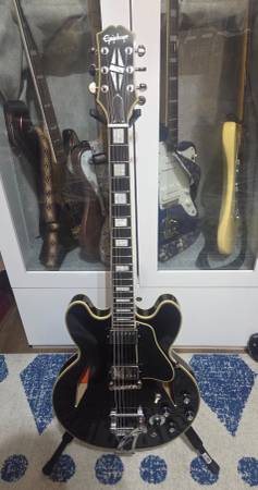 Signature model for Shinichi Ubukata of Japanese punk/rock bands Ellegarden and Nothing Carved in Stone. Sleek, awesome, beefy. Got some heft to it. Varitone dial. Diamond F holes. Bigsby. Has a Vibramate string spoiler installed (pops on and off) for easier restringing. Great condition with the custom hardshell. Cash and carry, asking 1000 or best offer. This is a limited run in the US.