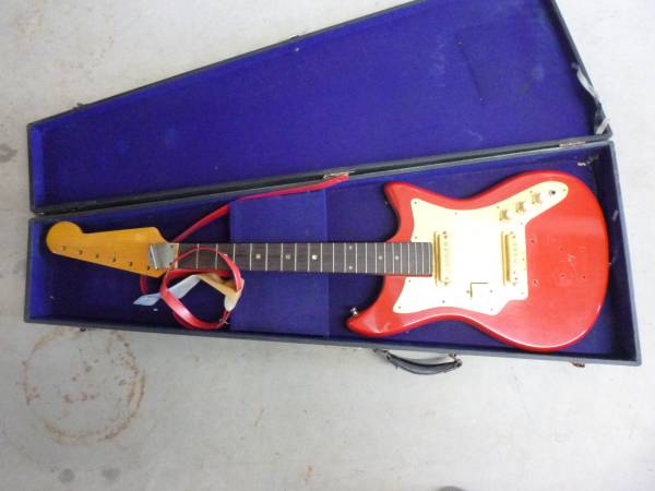 Pleasant Project Guitar -- 60's (?) MIJ -- this is the coolest guitar I never got around to repairing -- lots of components removed as I was going to clean it up and potentially repair the tailpiece -- the attachment point for the trem arm is broken -- TLC required -- I have these same square pole pickups on one of my main guitars and they are absolute microphonic feedback machines (my personal favorite but good to be aware of if that's not your thing) -- comes in original coffin case with original strap -- my laziness is your cool guitar -- $225