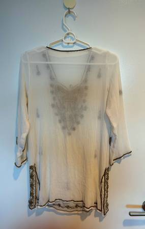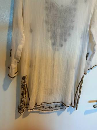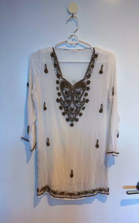 A shimmering ivory cotton and silk blend becomes a beautiful blouse by Isha Jain. Intricate gota embroidery combines with beads and sequins to surround the neckline and edge the sleeves. Similar to appliqué, gota embroidery involves adding a different fabric to the background to create new textures. Beadwork and sequins heighten the sense of elegance.
