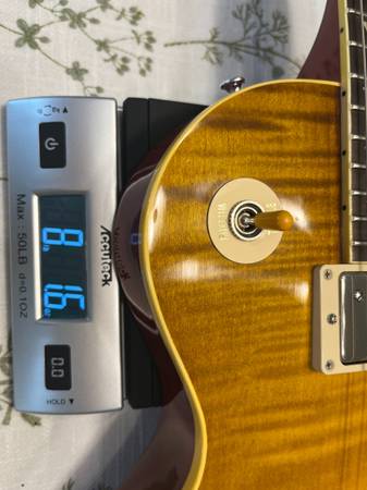 Body: Solid mahogany body with premium curly maple top in Cherry Sunburst finish & cream binding. Aluminum Stopbar tailpiece & Locking Tune-O-Matic bridge with nickel hardware. Single-ply cream pickguard & jackplate. Guitar weighs 8 lbs 1.6 oz.
