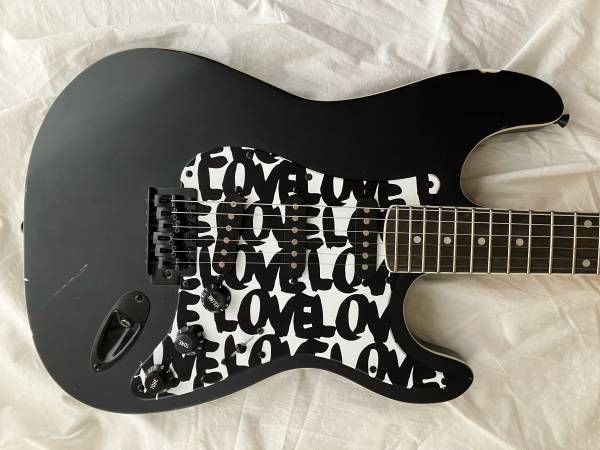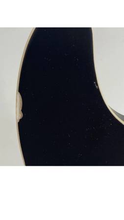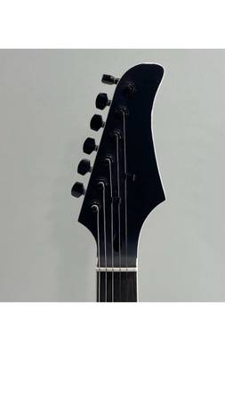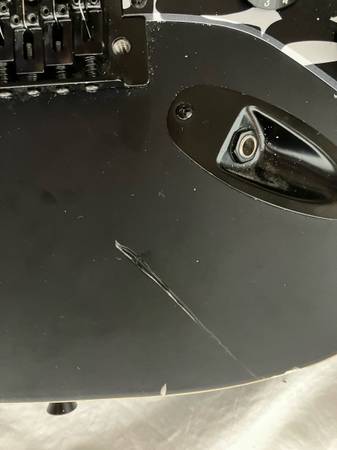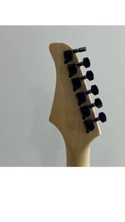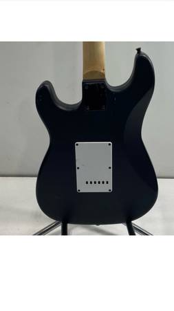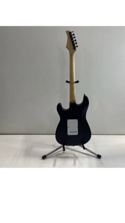 This is an unbranded matte black electric guitar with black hardware and a custom black and white pick guard. Some signs of wear but looks cool as it is. A new set of strings are installed. Full size. I have a thin case you can take it home with.
